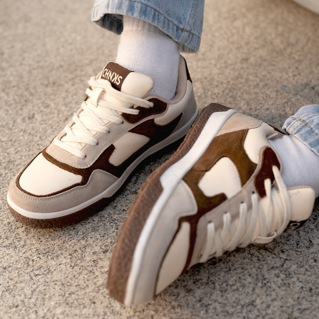 THE AFFOGATO CHNKS — a premium brown sneakers for men, perfect blend of bitter and sweet sophistication! The rich creamy white PU upper with subtle coffee brown suede leathers offer warmth and add depth to your effortless style. Revel in durability and comfort with the dual-toned TPR outsole, soft microfiber lining, and PU moulded insoles. Tie it all together with our flat cotton laces for a luscious look. The Affogato CHNKS is a delicious treat for your feet. Alternative lacing in brown colour available.
