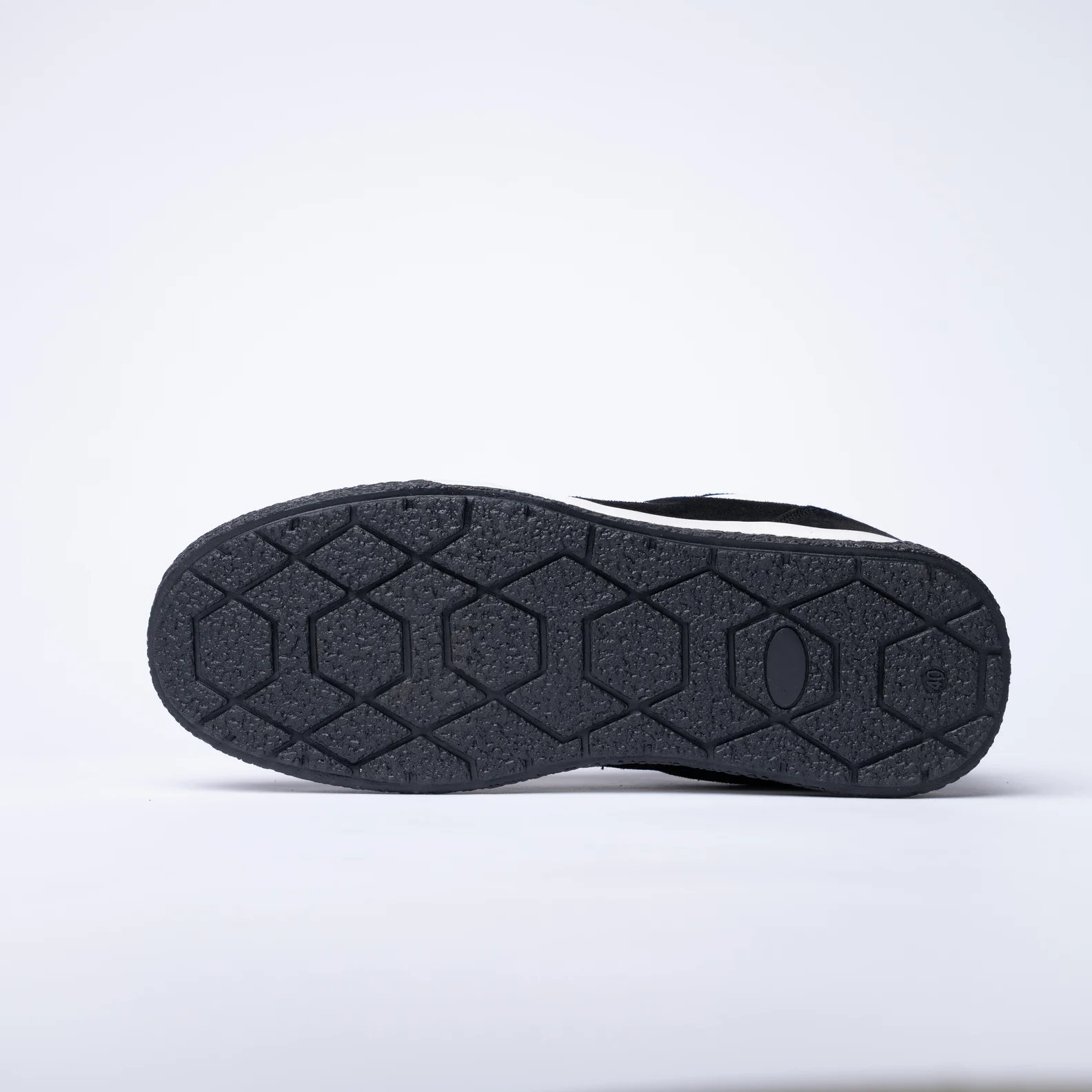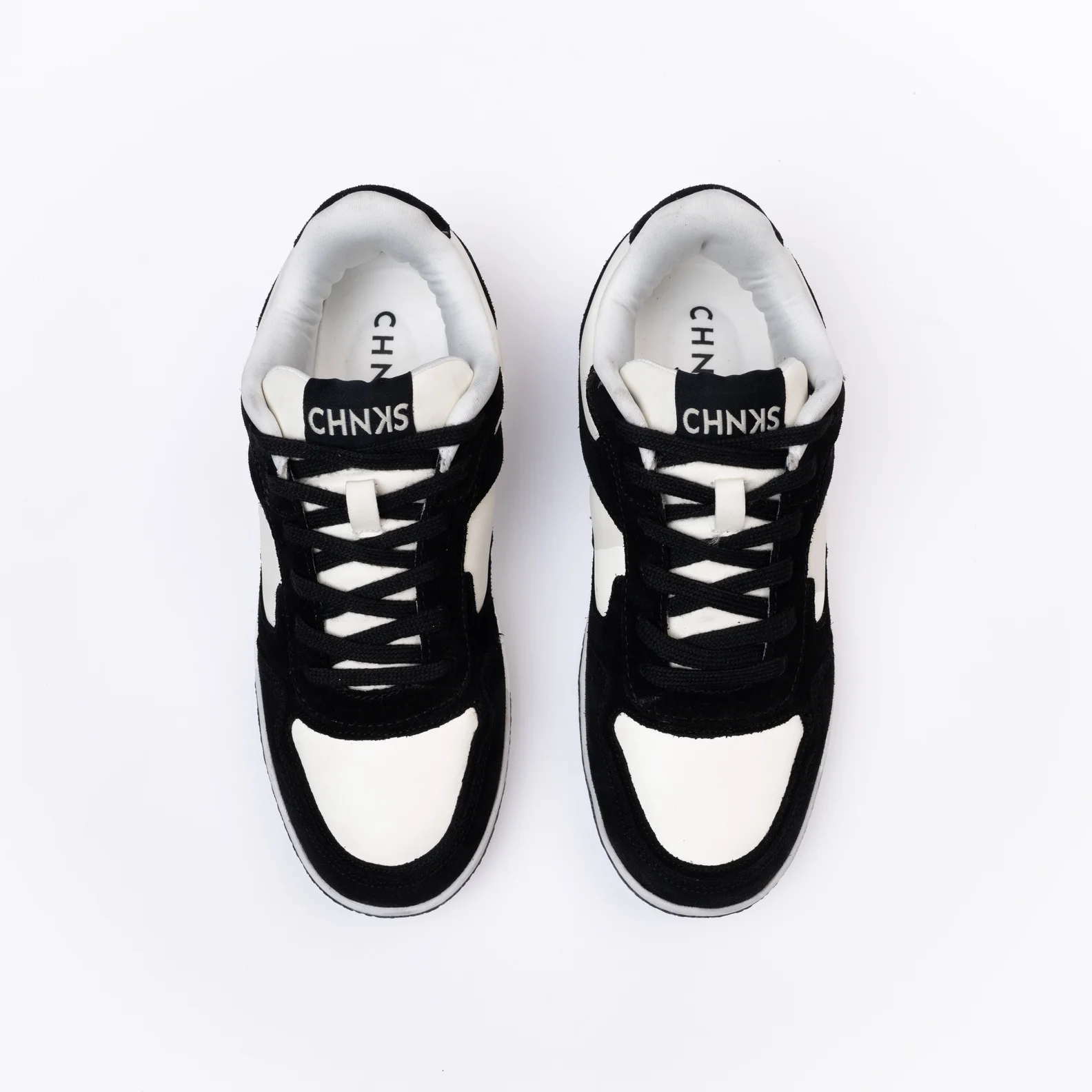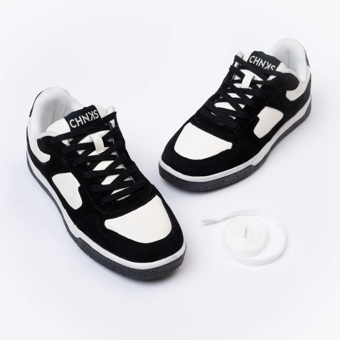 THE DALMATIAN CHNKS – black and white sneakers for men and women, where classic meets contemporary! The white PU upper paired with jet black suede leather creates a timeless monochrome look. Step with confidence on the dual-toned TPR outsole, enjoying comfort from the soft microfiber lining and PU-moulded insoles. Fasten with flat cotton laces for a sleek finish. The Dalmatian CHNKS is your classic companion for every step, with alternative black lacing available.